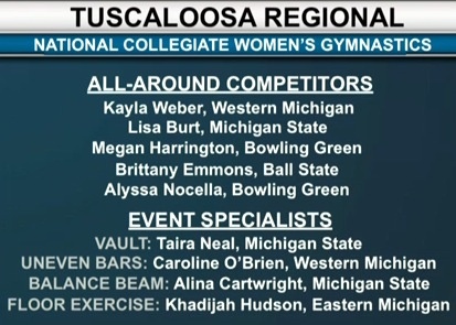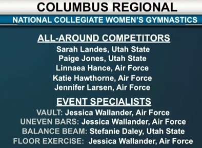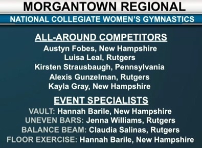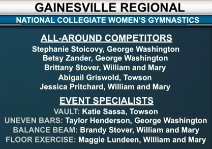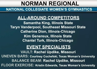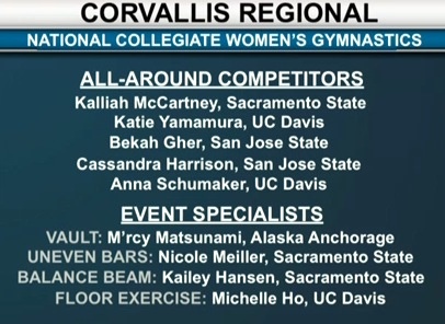 The TOP TWO teams and the top two all-around competitors (who are not on an advancing team) from each regional will qualify to the national championships in Los Angeles, California, April 19-21, hosted by UCLA. In addition, the event winners at each regional site will advance to the national championships (in that event only) if they are not part of a qualifying team or an all-around qualifier.