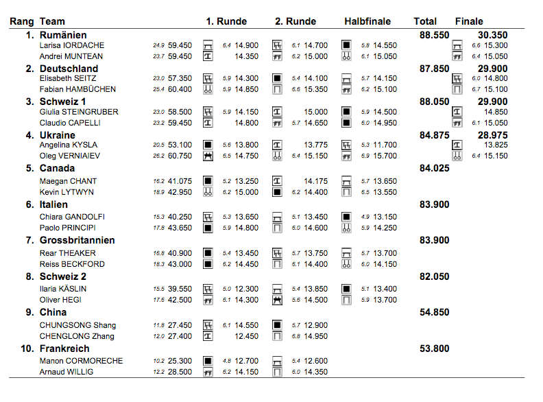 Larisa Iordache and Andrei Muntean won the Swiss Cup this weekend in Zurich, Switzerland. It was the first win for Romania at the Swiss Cup since 2007. It was a great showing for Iordache who fell twice on beam at last month's World Championships in Antwerp, Belgium. Elisabeth Seitz and Fabian Hambuchen of Germany followed the Romanians in second with Guila Steingruber and Claudio Capelli of Switzerland in third. This is a pairs competition with one male and one female per country competing in each rotation.