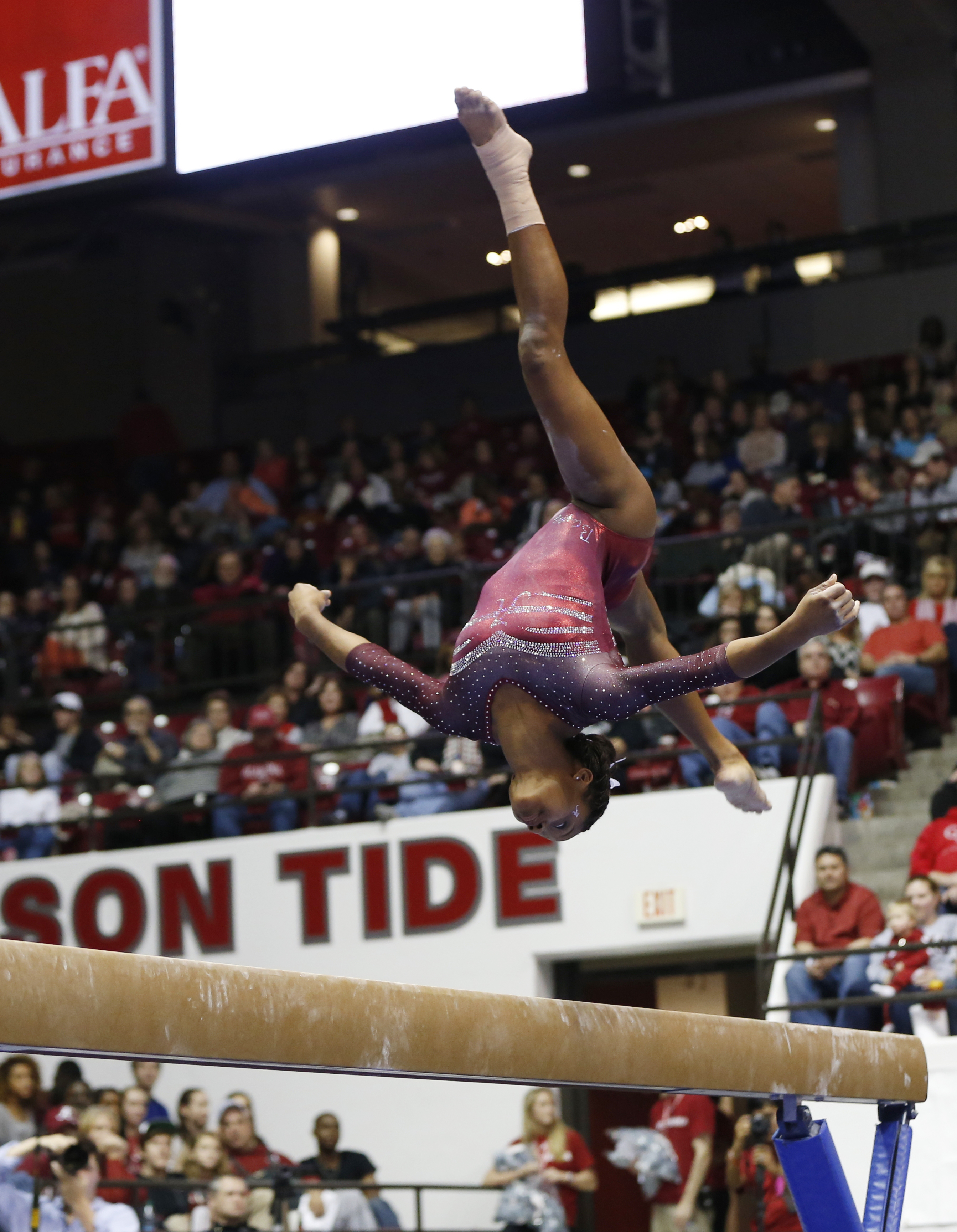 A crowd of over 13,000 fans saw their Crimson Tide extended their home winning streak with a come from behind win over the Georgia Gym Dogs. Alabama posted a season high 197.5 to Georgia’s 196.825.
