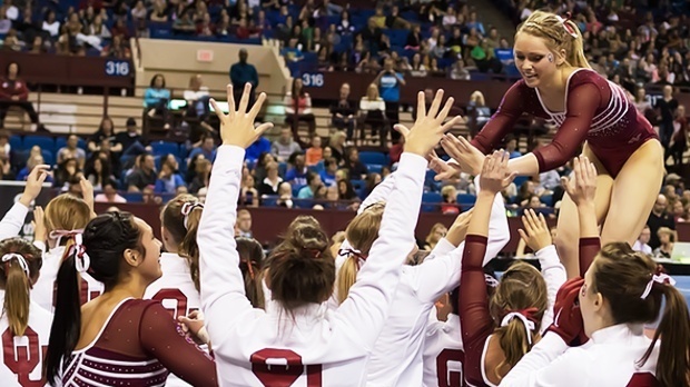 After a record breaking weekend, Oklahoma has moved to first place, edging out Florida by 0.117. LSU is close behind in third follwed by Utah in fourth and Alabama in fifth. The Sooners had a huge meet this weekend at the Metroplex Challenge and scored the highest team score in the nation this season of a 198.175. LSU was also at the Metroplex and they set a new school record with a team score of 197.875. Full results are available at Road to Nationals.