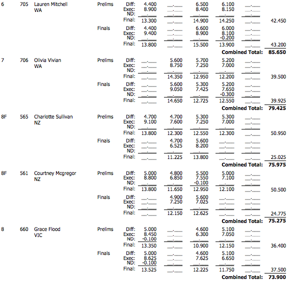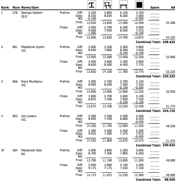 Mitchell also had a good evening, registering the top score on floor (13.9) as well as beam (15.5), while Victorian Larrissa Miller put in another outstanding performance on bars with a top score of 15.475. Isis Lowery’s score of 14.325 was the highest on vault in the final session.