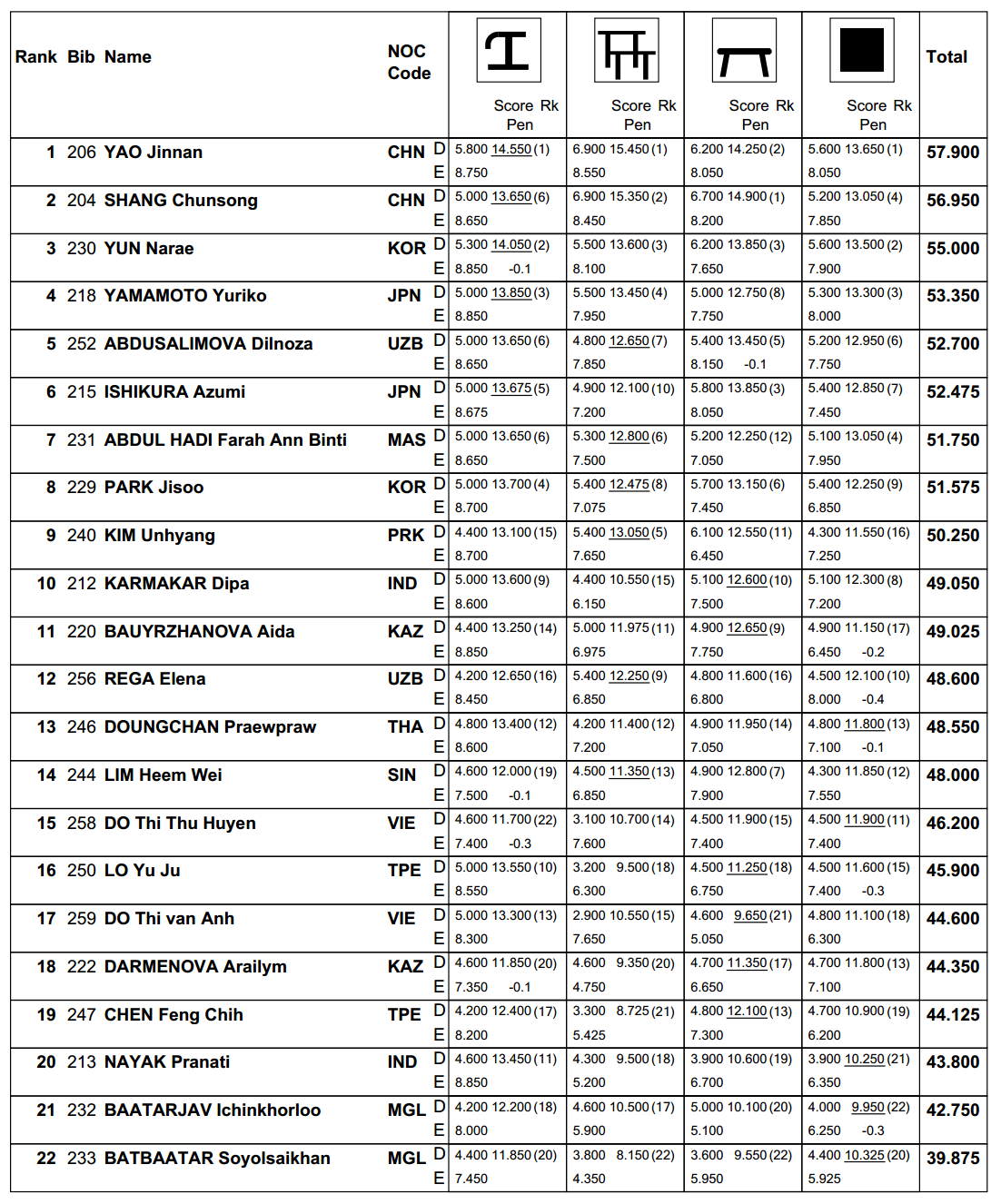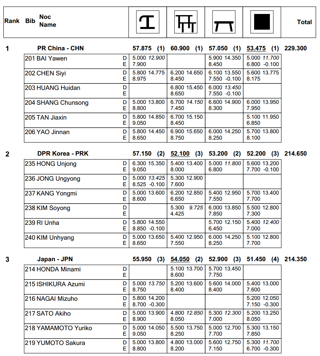 In the team final, the Chinese national team grabbed the gold medal after performing twenty consistent routines across the board. China won each event in the final, and put up a huge total score of 229.300. Placing second, DPR Korea scored a 214.650, while Japan earned the bronze medal with a 214.350.