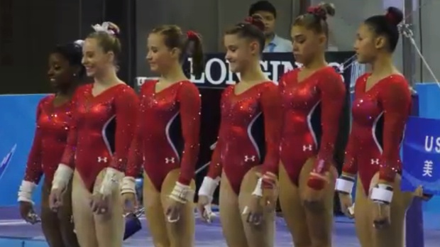 1. The girls went through line-up today and the order is likely a preview for team qualifications. The format for qualifications is 6-5-4: six on a team, five up on each event, and four scores count. The U.S. will start on beam.