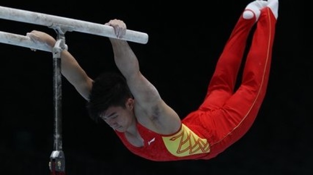 Ran Cheng started China off on the high bar. He performed with a huge laid out tkatchev- powerfully done with great hight and amplitude. Cheng showcased four massive release moves throughout his routine, finishing with a double layout double twist dismount, slight hop on the landing.