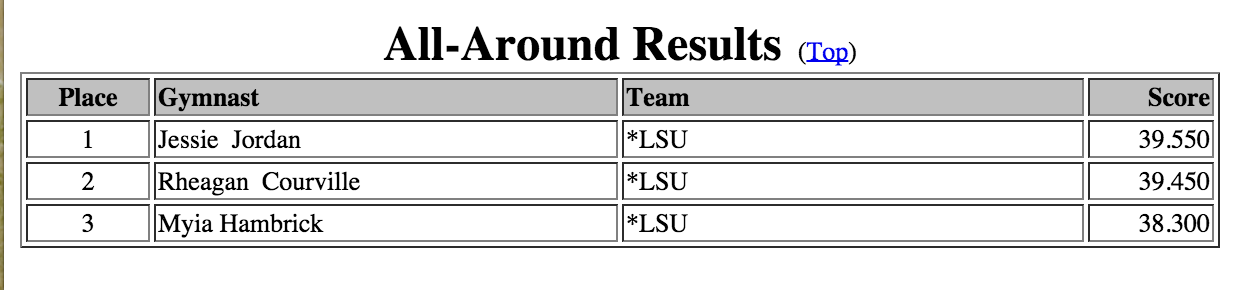 The No. 3 LSU Tigers made a meal out of the Iowa Hawkeyes in front of a season-opening record crowd of 5,665 fans, defeating their opponent 197.125 to 193.300. The Tigers had a 1-2-3 sweep on nearly event, with a gymnast from LSU capturing the each of the event titles. Senior Jessie Jordan took the all-around title with a 39.550, beam, and her first-ever floor title with a 9.925. Rheagan Courville added a 22nd vault title her career, winning the event with a 9.90 but she also scored a career high, and the event title, 9.975 on the uneven bars.
