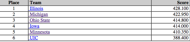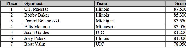 In the Individual events, 5 guys took top honors with CJ Maestes (Illinois) winning Floor (15.15) and Rings (15.4), Iowa's Doug Sullivan, Pommel Horse (14.9), Illinois Bobby Baker Vault (15.05), Illinois Jordan Valdez P-Bars (14.95), and Iowa's Cory Paterson High Bar (15.1)