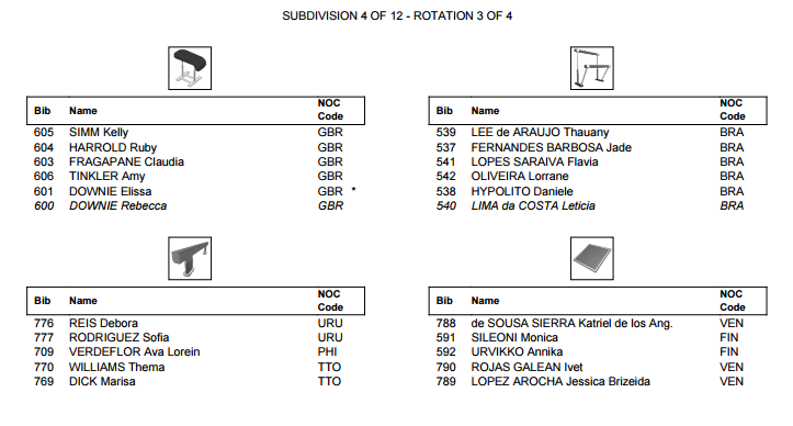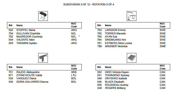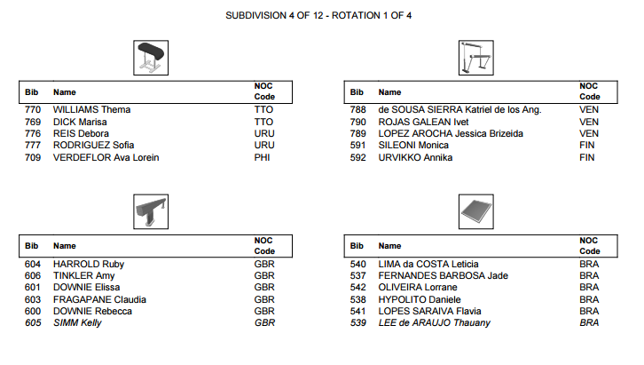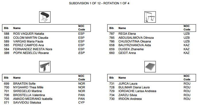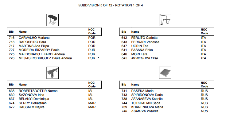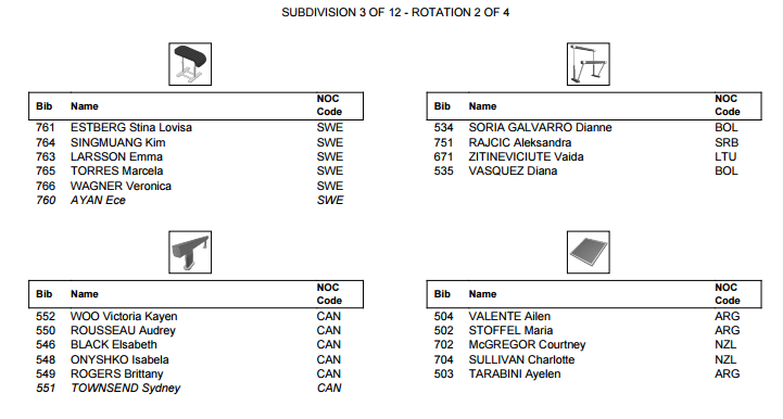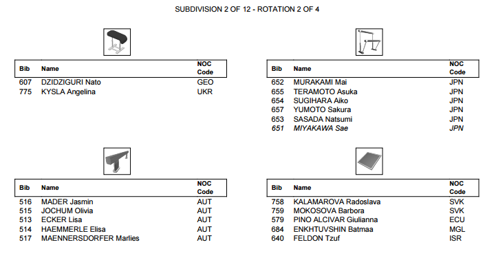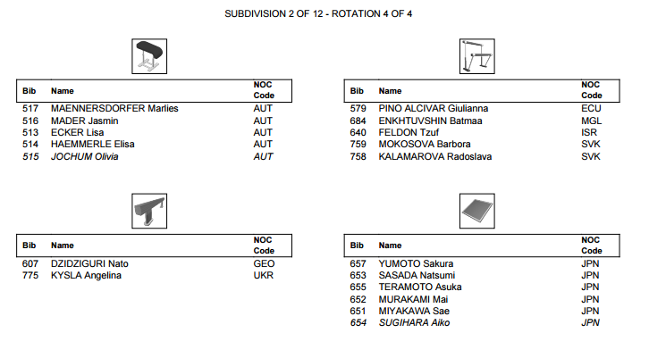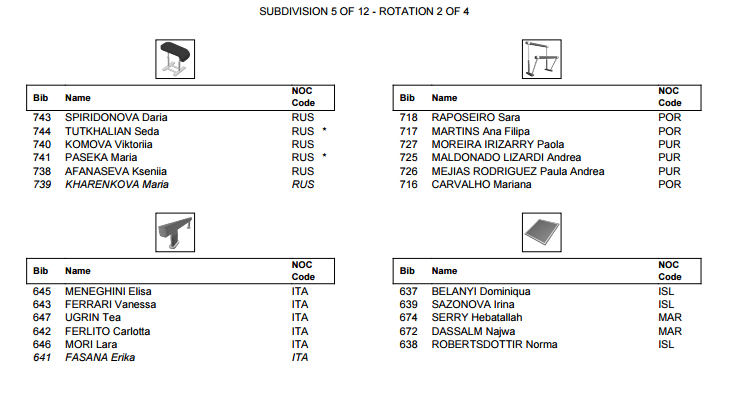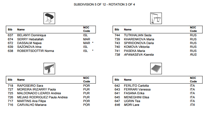 The official start list for each subdivision of tomorrow's competition via FIG: