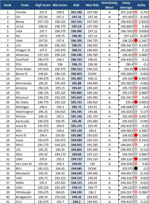 The women's teams are ranked using their Regional Qualifying Score, or RQS. This score is calculated by taking the team's top three AWAY scores, then taking the next three highest OTHER scores, throwing out the HIGH, and averaging the rest. With just one meet remaining, this maximum score is what determines the school's maximum possible RQS.